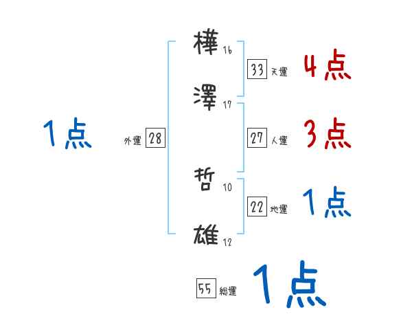 天運![]() | 樺澤哲雄さんの天運は33画の4つ星!権力志向でプライドが高い。勇気があり運を切り開き成功する。 家系が持つ宿命的な運勢を表します。祖先から受け継いだ苗字ですので自分の力が及びません。家柄を象徴します。 |