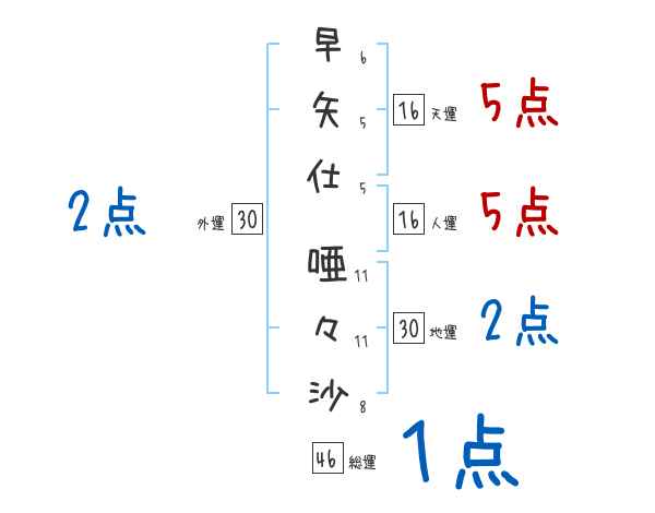 天運![]() | 早矢仕唖々沙さんの天運は16画の5つ星!人望が厚く大きく発展する。逆転成功が見える。 家系が持つ宿命的な運勢を表します。祖先から受け継いだ苗字ですので自分の力が及びません。家柄を象徴します。 |