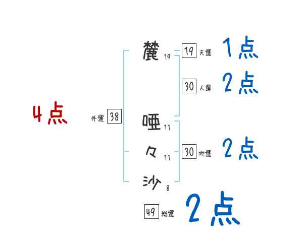 外運![]() | 麓唖々沙さんの外運は38画の4つ星!温厚な性格で技術的な才能を発揮する。職人的な仕事に向いている。 生活面を象徴する運勢です。外部から受ける影響力を表し、結婚運、家庭運や職場、環境への順応性を表します。 |