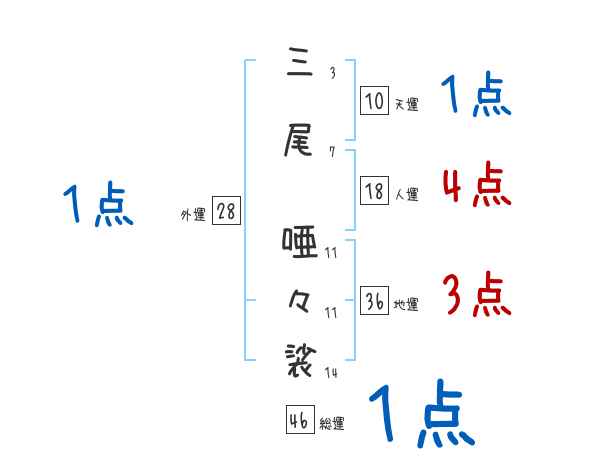 外運![]() | 三尾唖々裟さんの外運は28画の1つ星!家庭環境に注意。スポーツで活躍できる能力があるかも。 生活面を象徴する運勢です。外部から受ける影響力を表し、結婚運、家庭運や職場、環境への順応性を表します。 |