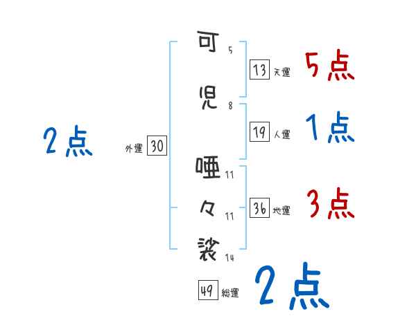 外運![]() | 可児唖々裟さんの外運は30画の2つ星!浮き沈みの激しさに注意しましょう。 生活面を象徴する運勢です。外部から受ける影響力を表し、結婚運、家庭運や職場、環境への順応性を表します。 |