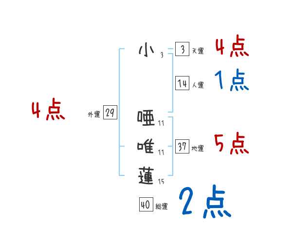 天運![]() | 小唖唯蓮さんの天運は3画の4つ星!活動的で才能に恵まれ、多くの信頼を得る。希望に満ち成長する。 家系が持つ宿命的な運勢を表します。祖先から受け継いだ苗字ですので自分の力が及びません。家柄を象徴します。 |
