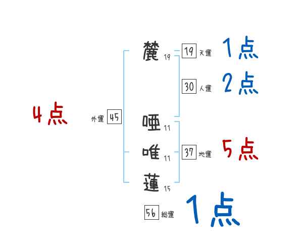 外運![]() | 麓唖唯蓮さんの外運は45画の4つ星!もくもくと物事を進め達成する。地味な努力家。 生活面を象徴する運勢です。外部から受ける影響力を表し、結婚運、家庭運や職場、環境への順応性を表します。 |
