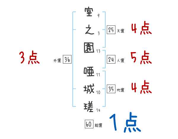 外運![]() | 室之園唖城瑳さんの外運は36画の3つ星!先見性が豊かです。多少神経質で苦労することも。 生活面を象徴する運勢です。外部から受ける影響力を表し、結婚運、家庭運や職場、環境への順応性を表します。 |