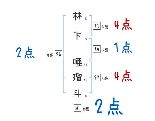 外運![]() | 林下唖瑠斗さんの外運は26画の2つ星!波瀾万丈かも。信頼できる人を大事にしましょう。 生活面を象徴する運勢です。外部から受ける影響力を表し、結婚運、家庭運や職場、環境への順応性を表します。 |
