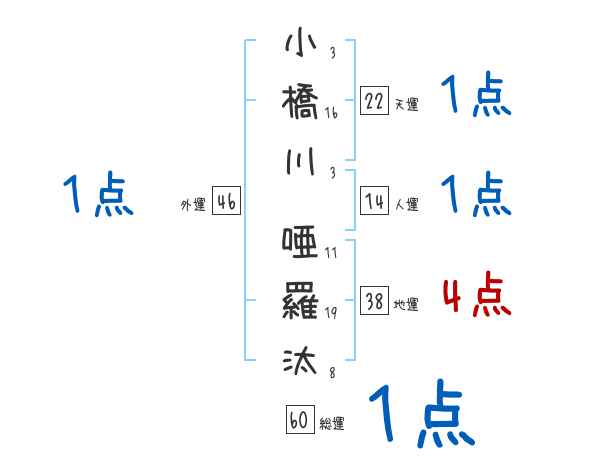 天運![]() | 小橋川唖羅汰さんの天運は22画の1つ星!努力することが苦手ないっぽう手先が器用。芸術性にも優れる。 家系が持つ宿命的な運勢を表します。祖先から受け継いだ苗字ですので自分の力が及びません。家柄を象徴します。 |
