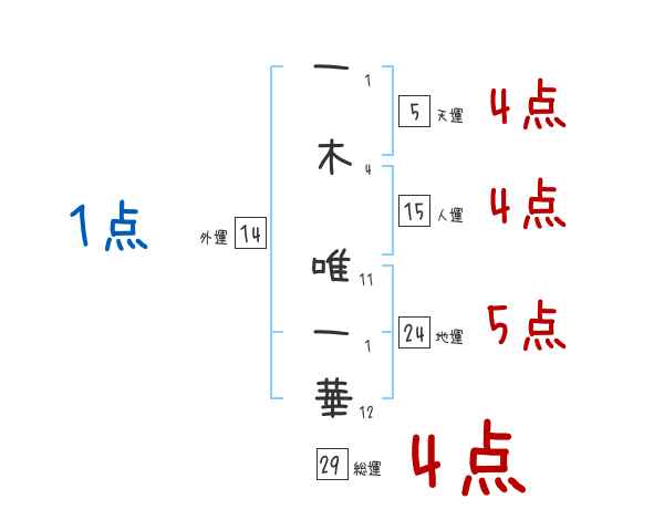 天運![]() | 一木唯一華さんの天運は5画の4つ星!健康で安泰。協調性に優れ、財産に恵まれる。 家系が持つ宿命的な運勢を表します。祖先から受け継いだ苗字ですので自分の力が及びません。家柄を象徴します。 |