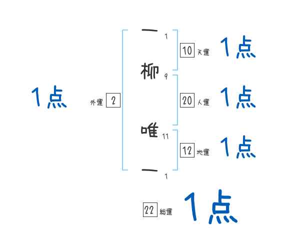 総運![]() | 一柳唯一さんの総運は22画の1つ星!努力することが苦手ないっぽう手先が器用。芸術性にも優れる。 あなたの人生を表す1番重要な運勢です。生涯を通じて影響する総合運となり、主に50歳以降の晩年期に影響を及ぼします。 |