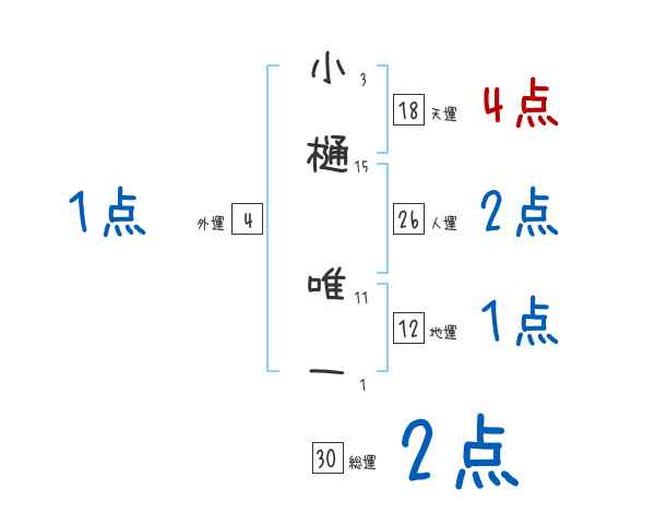 天運![]() | 小樋唯一さんの天運は18画の4つ星!情熱的で剛気。忍耐力があり信頼される。 家系が持つ宿命的な運勢を表します。祖先から受け継いだ苗字ですので自分の力が及びません。家柄を象徴します。 |