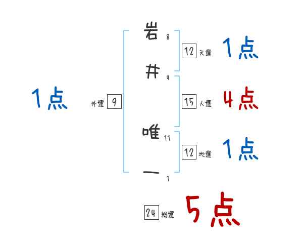 天運![]() | 岩井唯一さんの天運は12画の1つ星!簡単な失敗で諦めてしまいやすいかも。着実に行動すると良いでしょう。 家系が持つ宿命的な運勢を表します。祖先から受け継いだ苗字ですので自分の力が及びません。家柄を象徴します。 |