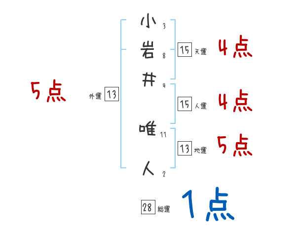 外運![]() | 小岩井唯人さんの外運は13画の5つ星!才能に恵まれ人気がある。名声を手に入れる。円満な人生。 生活面を象徴する運勢です。外部から受ける影響力を表し、結婚運、家庭運や職場、環境への順応性を表します。 |