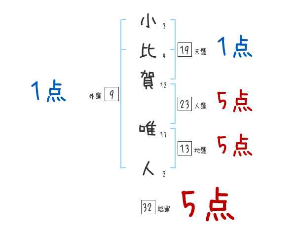 総運![]() | 小比賀唯人さんの総運は32画の5つ星!柔軟性があり成功する。チャンスが多く金運が良い。 あなたの人生を表す1番重要な運勢です。生涯を通じて影響する総合運となり、主に50歳以降の晩年期に影響を及ぼします。 |