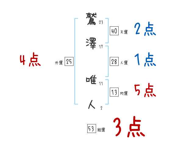 天運![]() | 鷲澤唯人さんの天運は40画の2つ星!自信過剰で物事に固執するためトラブルに注意。 家系が持つ宿命的な運勢を表します。祖先から受け継いだ苗字ですので自分の力が及びません。家柄を象徴します。 |