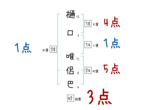 天運![]() | 樋口唯侶巴さんの天運は18画の4つ星!情熱的で剛気。忍耐力があり信頼される。 家系が持つ宿命的な運勢を表します。祖先から受け継いだ苗字ですので自分の力が及びません。家柄を象徴します。 |