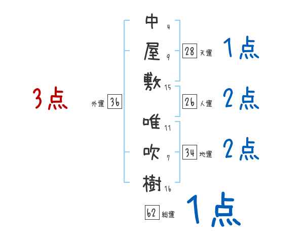 外運![]() | 中屋敷唯吹樹さんの外運は36画の3つ星!先見性が豊かです。多少神経質で苦労することも。 生活面を象徴する運勢です。外部から受ける影響力を表し、結婚運、家庭運や職場、環境への順応性を表します。 |