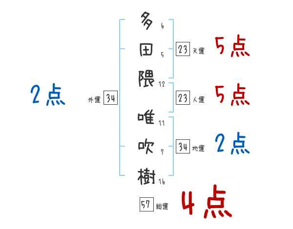 人運![]() | 多田隈唯吹樹さんの人運は23画の5つ星!想像力に優れ活力がある。一代で成功し名誉を手に入れる。 性格や才能などを表す2番目に重要な運勢です。人間関係や協調性、社会的な成功に影響します。主に20歳から50歳ぐらいまでの中年期の運勢を表します。 |