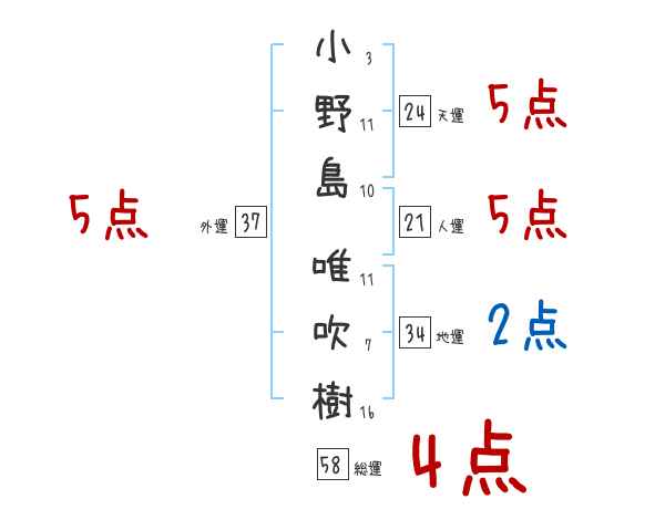 人運![]() | 小野島唯吹樹さんの人運は21画の5つ星!統率力がある。独立し成功する。名誉を手に入れる。 性格や才能などを表す2番目に重要な運勢です。人間関係や協調性、社会的な成功に影響します。主に20歳から50歳ぐらいまでの中年期の運勢を表します。 |