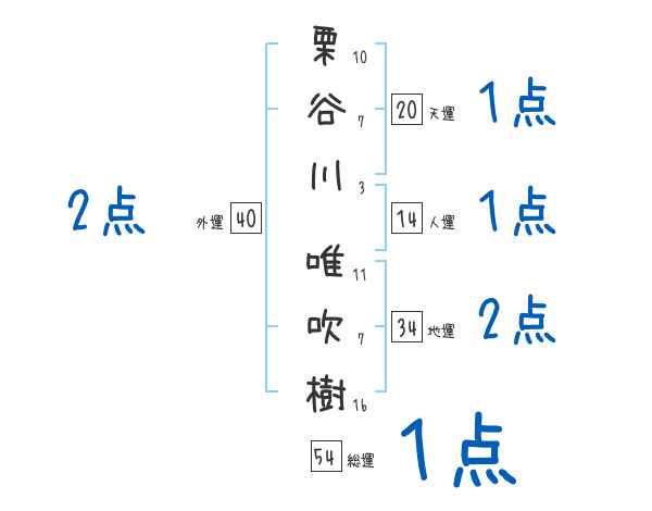 外運![]() | 栗谷川唯吹樹さんの外運は40画の2つ星!自信過剰で物事に固執するためトラブルに注意。 生活面を象徴する運勢です。外部から受ける影響力を表し、結婚運、家庭運や職場、環境への順応性を表します。 |