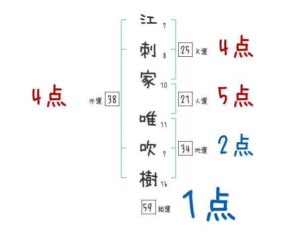 天運![]() | 江刺家唯吹樹さんの天運は25画の4つ星!個性があり才能があふれる。強運の持ち主で発展する。 家系が持つ宿命的な運勢を表します。祖先から受け継いだ苗字ですので自分の力が及びません。家柄を象徴します。 |