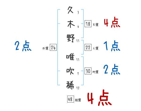 天運![]() | 久木野唯吹稀さんの天運は18画の4つ星!情熱的で剛気。忍耐力があり信頼される。 家系が持つ宿命的な運勢を表します。祖先から受け継いだ苗字ですので自分の力が及びません。家柄を象徴します。 |
