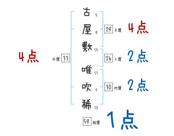 天運![]() | 古屋敷唯吹稀さんの天運は29画の4つ星!完全主義で才能がある。厳格な心の持ち主。 家系が持つ宿命的な運勢を表します。祖先から受け継いだ苗字ですので自分の力が及びません。家柄を象徴します。 |