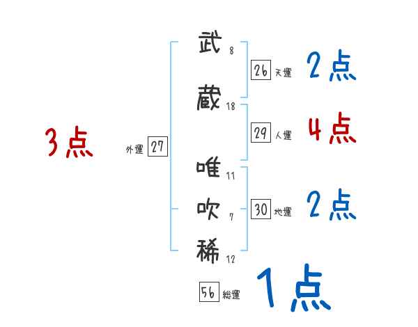 天運![]() | 武蔵唯吹稀さんの天運は26画の2つ星!波瀾万丈かも。信頼できる人を大事にしましょう。 家系が持つ宿命的な運勢を表します。祖先から受け継いだ苗字ですので自分の力が及びません。家柄を象徴します。 |