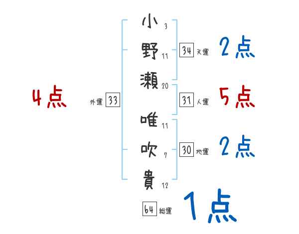 小野瀬唯吹貴さんの画数の鑑定結果
