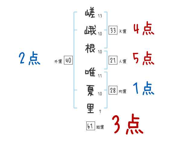 総運![]() | 嵯峨根唯夏里さんの総運は61画の3つ星!強情な性格でうぬぼれタイプ。自ら破滅する。 あなたの人生を表す1番重要な運勢です。生涯を通じて影響する総合運となり、主に50歳以降の晩年期に影響を及ぼします。 |