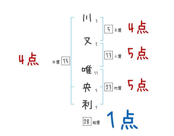 | 天運  | 川又唯央利さんの天運は5画の4つ星!健康で安泰。協調性に優れ、財産に恵まれる。家系が持つ宿命的な運勢を表します。祖先から受け継いだ苗字ですので自分の力が及びません。家柄を象徴します。 |