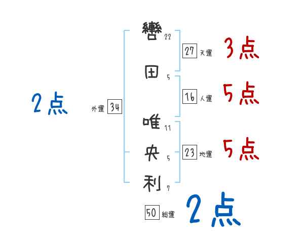 外運![]() | 轡田唯央利さんの外運は34画の2つ星!独創性に優れるが、自尊心が強く災難に注意しましょう。 生活面を象徴する運勢です。外部から受ける影響力を表し、結婚運、家庭運や職場、環境への順応性を表します。 |