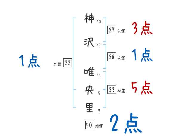 天運![]() | 神沢唯央里さんの天運は27画の3つ星!頭脳明晰だが強情で摩擦が多い傾向。孤立に注意。 家系が持つ宿命的な運勢を表します。祖先から受け継いだ苗字ですので自分の力が及びません。家柄を象徴します。 |