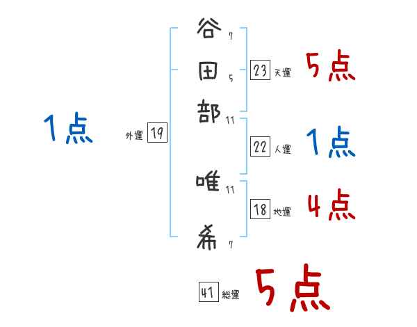 天運![]() | 谷田部唯希さんの天運は23画の5つ星!想像力に優れ活力がある。一代で成功し名誉を手に入れる。 家系が持つ宿命的な運勢を表します。祖先から受け継いだ苗字ですので自分の力が及びません。家柄を象徴します。 |