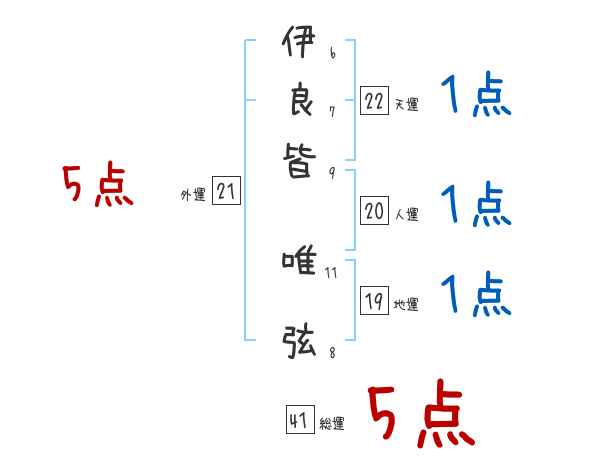 総運![]() | 伊良皆唯弦さんの総運は41画の5つ星!大志を抱き、目標に向かって実力を発揮し達成する。温和な性格。 あなたの人生を表す1番重要な運勢です。生涯を通じて影響する総合運となり、主に50歳以降の晩年期に影響を及ぼします。 |