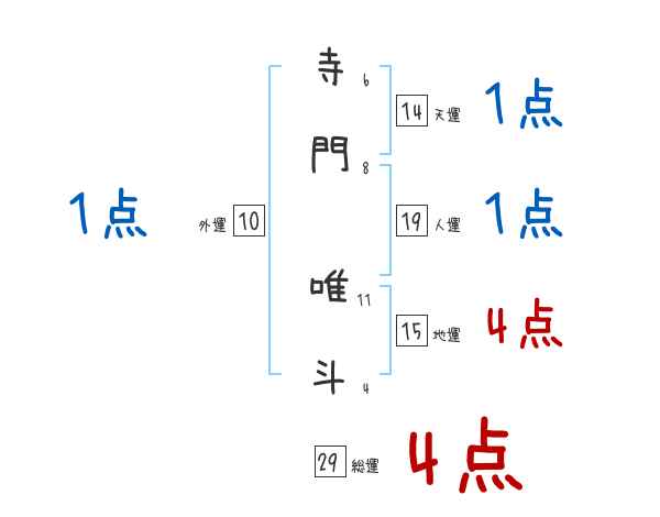 天運![]() | 寺門唯斗さんの天運は14画の1つ星!人に対して優しいがストレスを溜め込みがち。人間関係のトラブルを避けるよう気をつけましょう。 家系が持つ宿命的な運勢を表します。祖先から受け継いだ苗字ですので自分の力が及びません。家柄を象徴します。 |