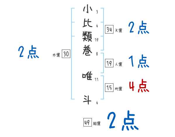 人運![]() | 小比類巻唯斗さんの人運は19画の1つ星!優れた才能を持ちますが、協調性が足りないことも。周りの人と協力する事を意識しましょう。 性格や才能などを表す2番目に重要な運勢です。人間関係や協調性、社会的な成功に影響します。主に20歳から50歳ぐらいまでの中年期の運勢を表します。 |