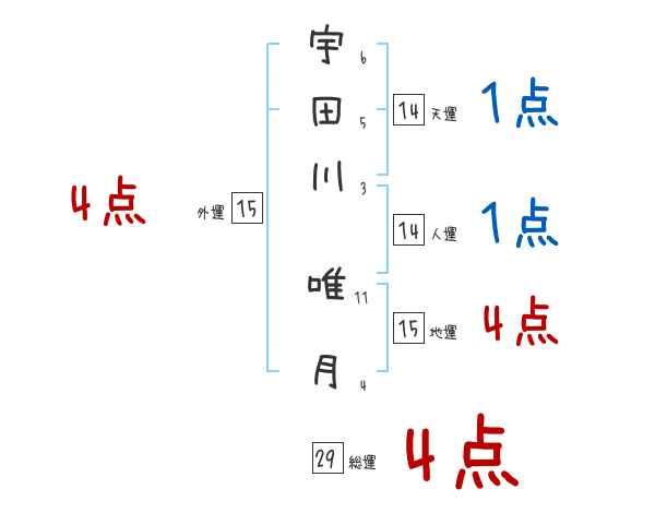 総運![]() | 宇田川唯月さんの総運は29画の4つ星!完全主義で才能がある。厳格な心の持ち主。 あなたの人生を表す1番重要な運勢です。生涯を通じて影響する総合運となり、主に50歳以降の晩年期に影響を及ぼします。 |