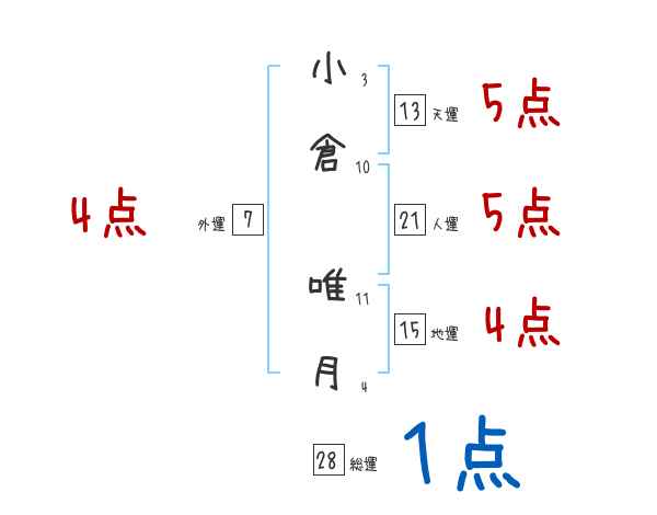 総運![]() | 小倉唯月さんの総運は28画の1つ星!家庭環境に注意。スポーツで活躍できる能力があるかも。 あなたの人生を表す1番重要な運勢です。生涯を通じて影響する総合運となり、主に50歳以降の晩年期に影響を及ぼします。 |