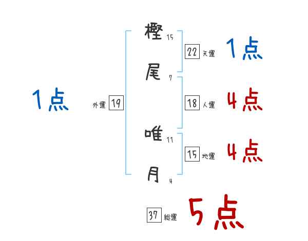 総運![]() | 樫尾唯月さんの総運は37画の5つ星!努力家で順応性に優れる。現実的な考え方ができ忠実に物事をこなす。 あなたの人生を表す1番重要な運勢です。生涯を通じて影響する総合運となり、主に50歳以降の晩年期に影響を及ぼします。 |