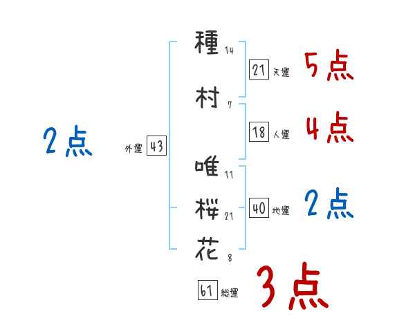 天運![]() | 種村唯桜花さんの天運は21画の5つ星!統率力がある。独立し成功する。名誉を手に入れる。 家系が持つ宿命的な運勢を表します。祖先から受け継いだ苗字ですので自分の力が及びません。家柄を象徴します。 |