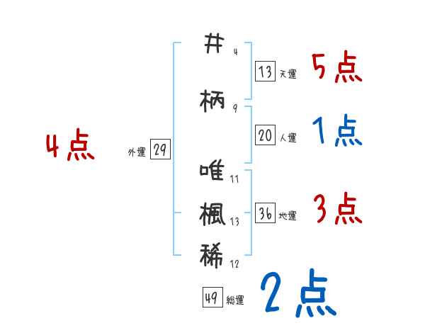 総運![]() | 井柄唯楓稀さんの総運は49画の2つ星!不安定な性格で明暗がある人生。周りの人には支援されやすい。 あなたの人生を表す1番重要な運勢です。生涯を通じて影響する総合運となり、主に50歳以降の晩年期に影響を及ぼします。 |