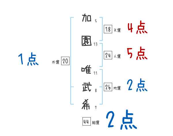 地運![]() | 加園唯武希さんの地運は26画の2つ星!波瀾万丈かも。信頼できる人を大事にしましょう。 個性を表す基礎的な運勢です。性格形成や対人関係、行動力など家庭環境に影響されます。主に誕生してから20歳くらいまでの若年期の運勢を表します。 |