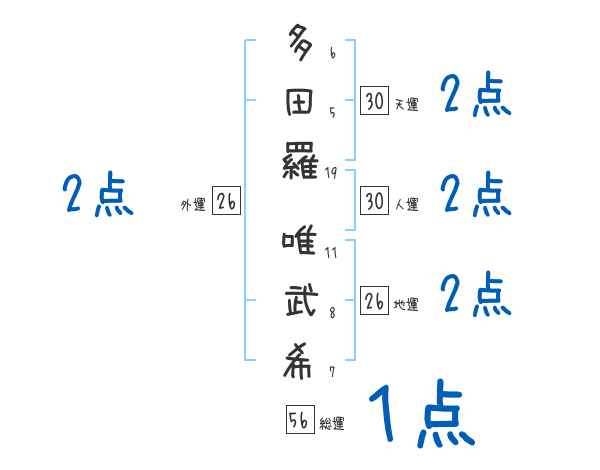 天運![]() | 多田羅唯武希さんの天運は30画の2つ星!浮き沈みの激しさに注意しましょう。 家系が持つ宿命的な運勢を表します。祖先から受け継いだ苗字ですので自分の力が及びません。家柄を象徴します。 |