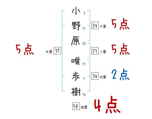 天運![]() | 小野原唯歩樹さんの天運は24画の5つ星!家庭運が良く順調な人生。金運にも恵まれる。 家系が持つ宿命的な運勢を表します。祖先から受け継いだ苗字ですので自分の力が及びません。家柄を象徴します。 |