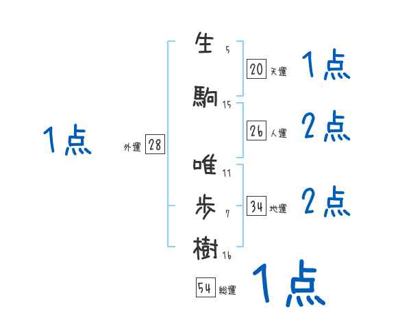総運![]() | 生駒唯歩樹さんの総運は54画の1つ星!トラブルが多いかも。周りをよく見て協調して過ごしましょう。 あなたの人生を表す1番重要な運勢です。生涯を通じて影響する総合運となり、主に50歳以降の晩年期に影響を及ぼします。 |