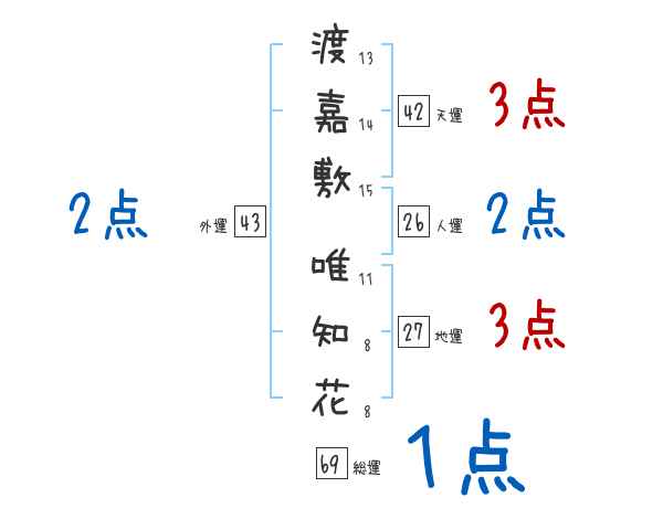 地運![]() | 渡嘉敷唯知花さんの地運は27画の3つ星!頭脳明晰だが強情で摩擦が多い傾向。孤立に注意。 個性を表す基礎的な運勢です。性格形成や対人関係、行動力など家庭環境に影響されます。主に誕生してから20歳くらいまでの若年期の運勢を表します。 |