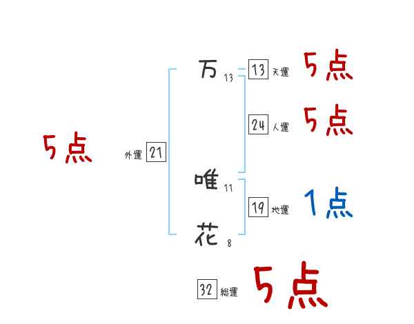 総運![]() | 万唯花さんの総運は32画の5つ星!柔軟性があり成功する。チャンスが多く金運が良い。 あなたの人生を表す1番重要な運勢です。生涯を通じて影響する総合運となり、主に50歳以降の晩年期に影響を及ぼします。 |