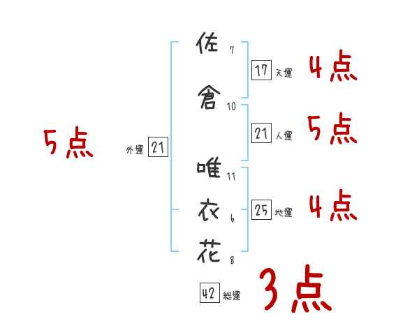 外運![]() | 佐倉唯衣花さんの外運は21画の5つ星!統率力がある。独立し成功する。名誉を手に入れる。 生活面を象徴する運勢です。外部から受ける影響力を表し、結婚運、家庭運や職場、環境への順応性を表します。 |