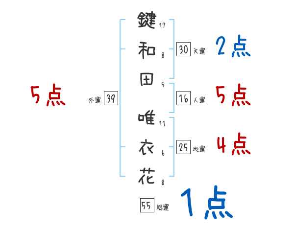 外運![]() | 鍵和田唯衣花さんの外運は39画の5つ星!社交性に優れ人望が厚い。人の上に立ち成功する。 生活面を象徴する運勢です。外部から受ける影響力を表し、結婚運、家庭運や職場、環境への順応性を表します。 |