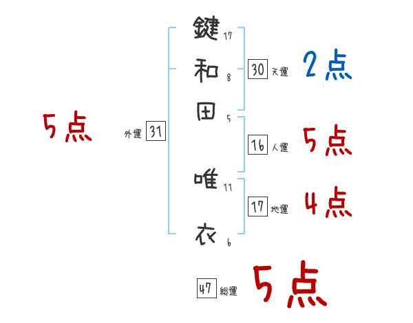 総運![]() | 鍵和田唯衣さんの総運は47画の5つ星!実力が開花し発展する円満な人生。財に恵まれる。 あなたの人生を表す1番重要な運勢です。生涯を通じて影響する総合運となり、主に50歳以降の晩年期に影響を及ぼします。 |