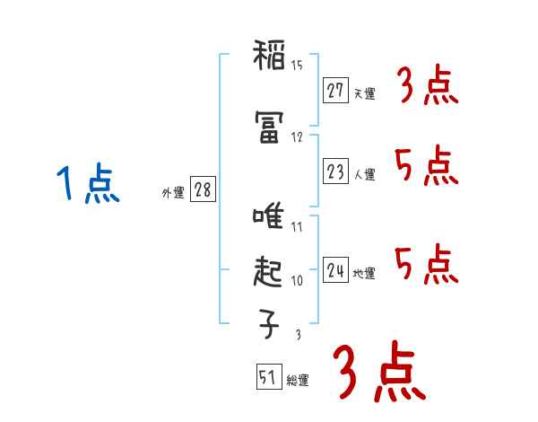 天運![]() | 稲冨唯起子さんの天運は27画の3つ星!頭脳明晰だが強情で摩擦が多い傾向。孤立に注意。 家系が持つ宿命的な運勢を表します。祖先から受け継いだ苗字ですので自分の力が及びません。家柄を象徴します。 |